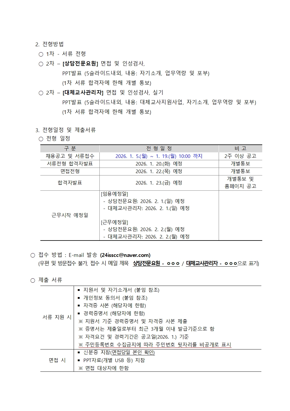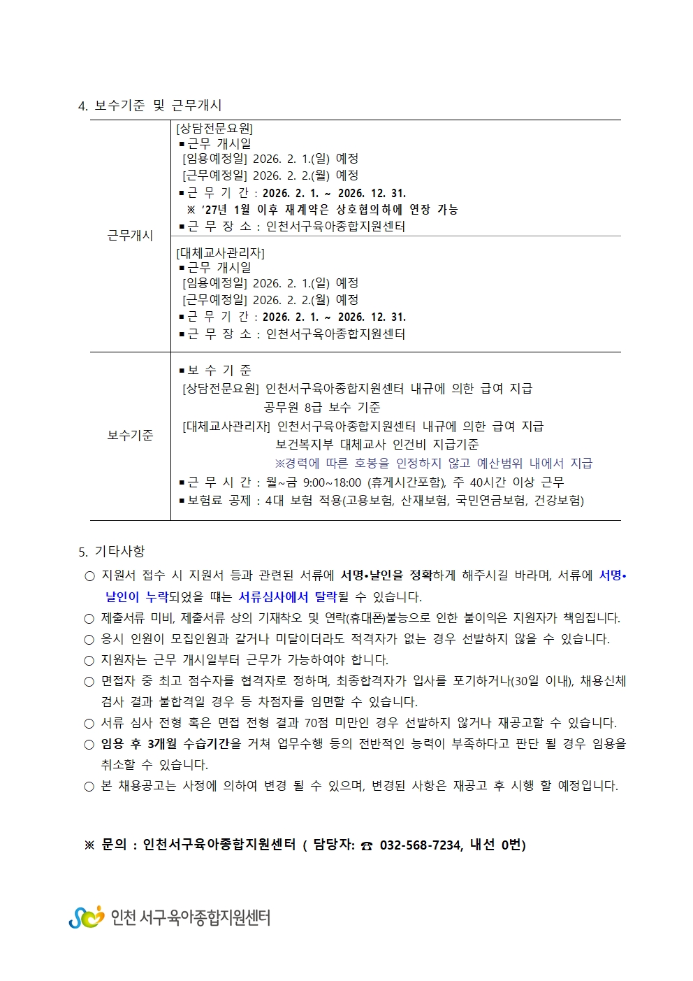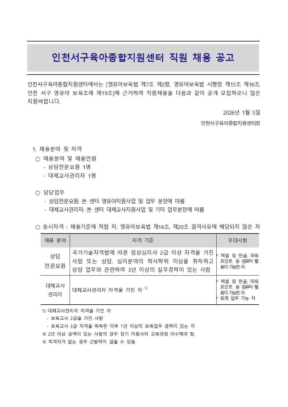 [인천서구육아종합지원센터] 직원( 대체교사관리자, 상담전문요원) 채용