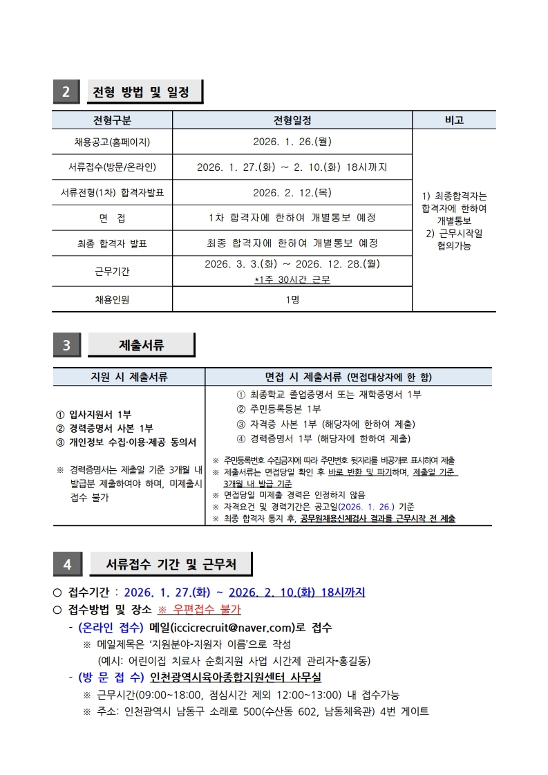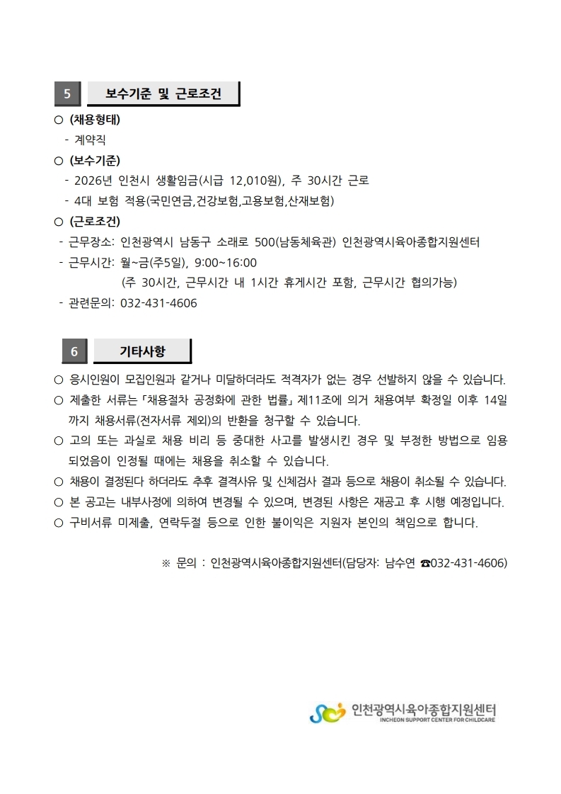 [인천광역시육아종합지원센터] 인천광역시육아종합지원센터 어린이집 치료사 순회지원 사업(시간제 관리자) 채용 공고