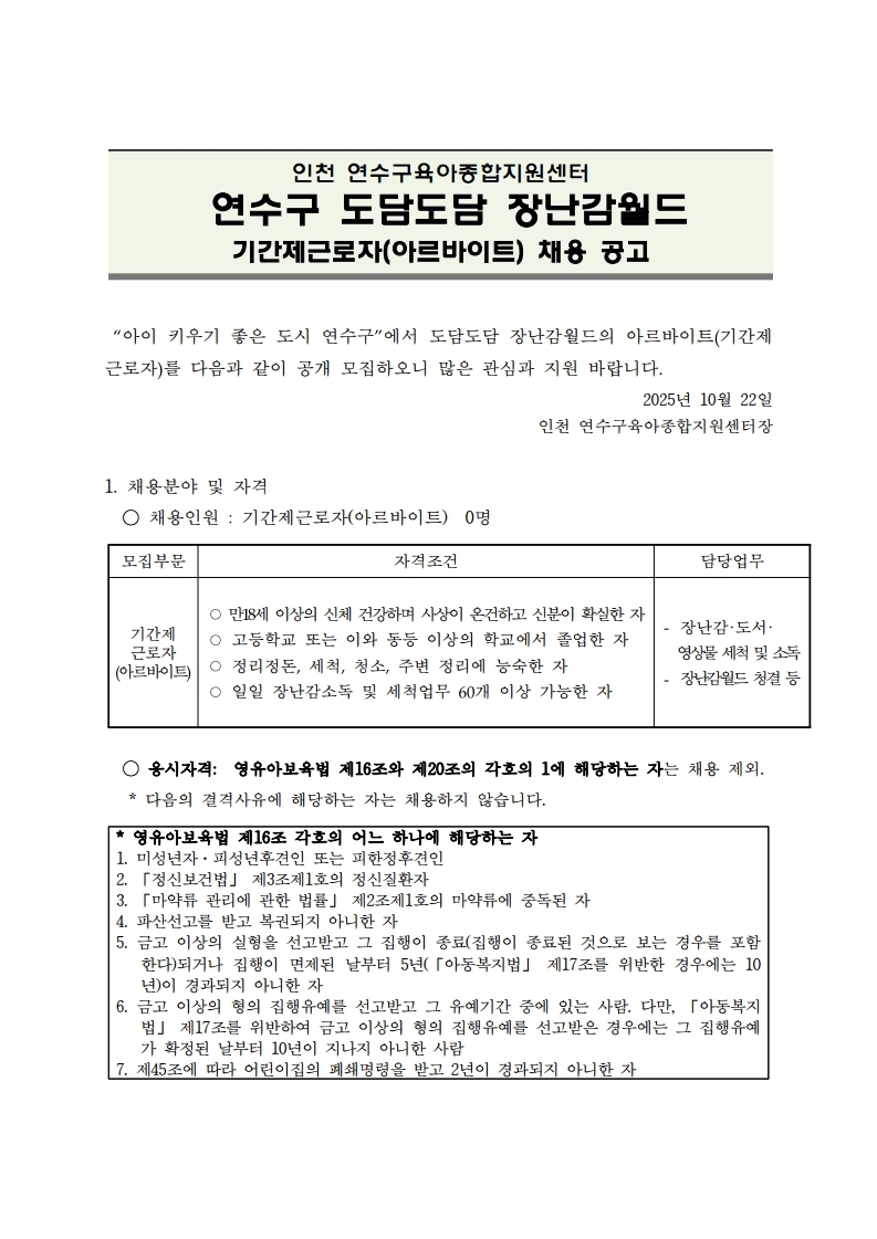 [연수구육아종합지원센터] 연수구 도담도담 장난감월드 기간제(아르바이트) 근로자 채용공고