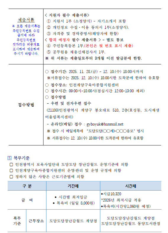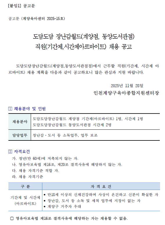[계양구육아종합지원센터] 도담도담장난감월드 계양점 직원(일반직) 채용 공고문