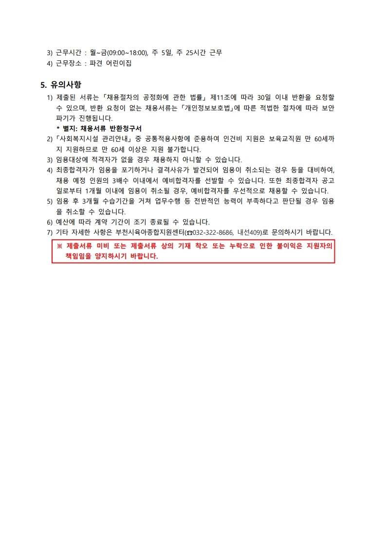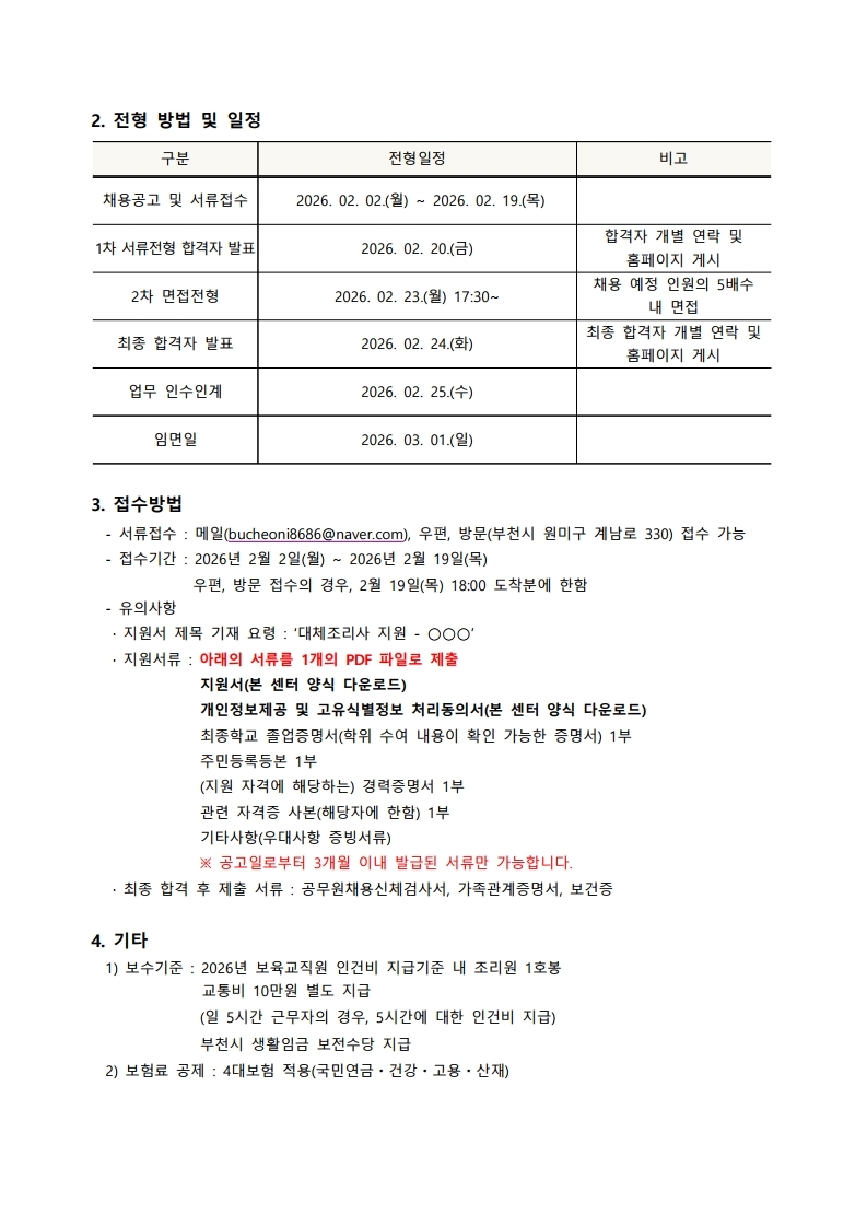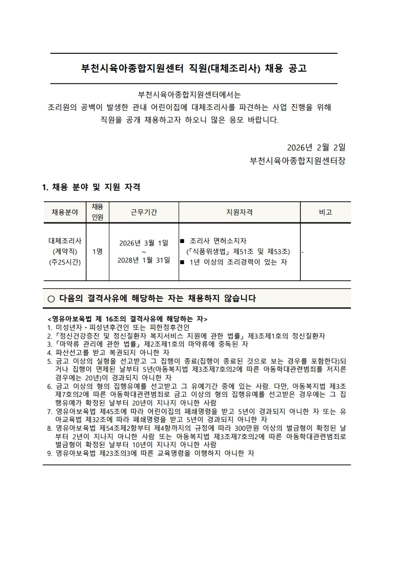 [부천시육아종합지원센터] 직원 채용공고(대체조리사)