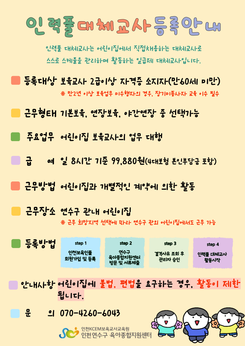 [연수구육아종합지원센터] 직접채용 대체교사 2월 등록안내