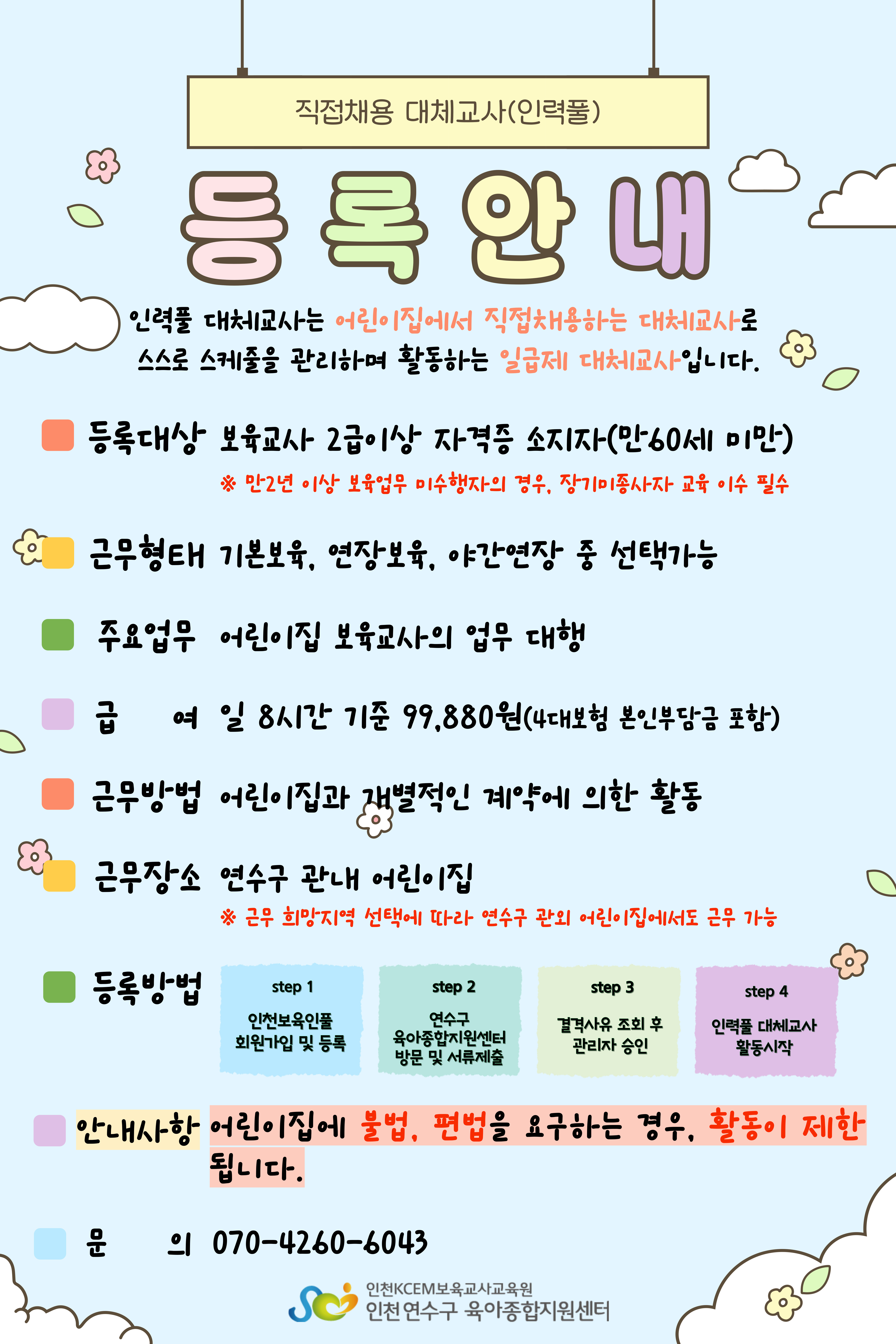 [연수구육아종합지원센터] 직접채용 대체교사 3월 등록
