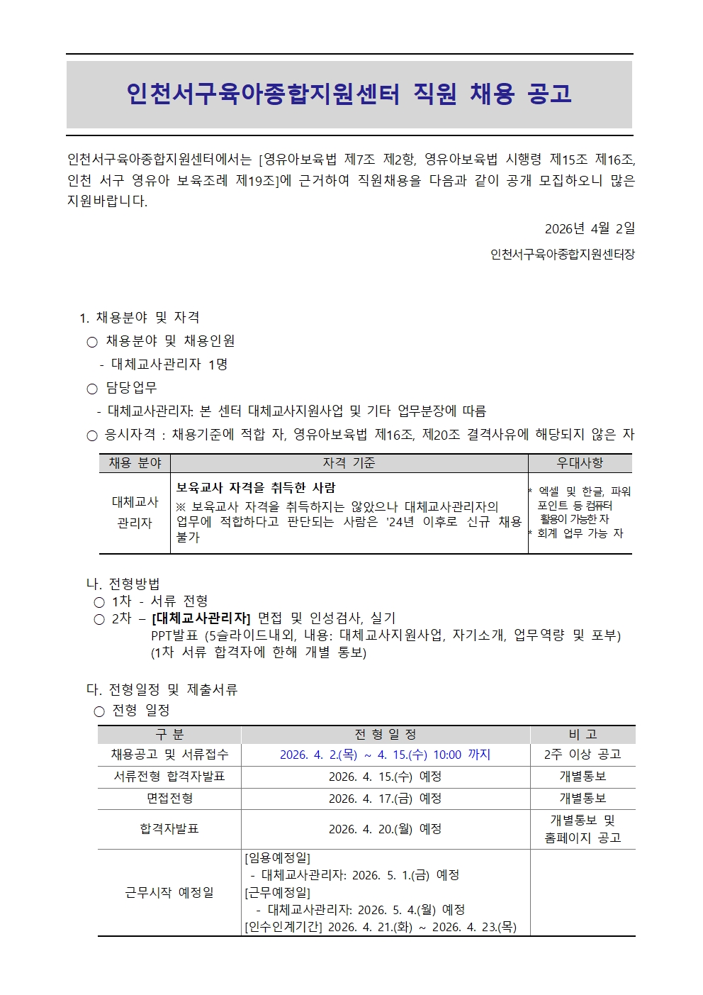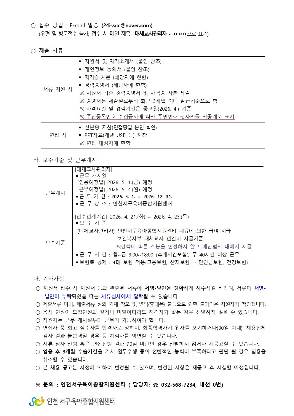 [인천서구육아종합지원센터] 직원(대체교사관리자) 채용 공고