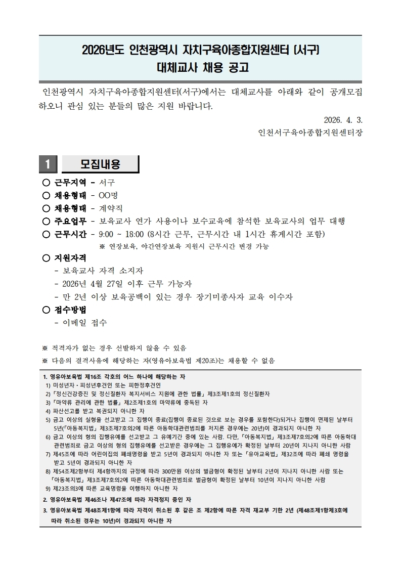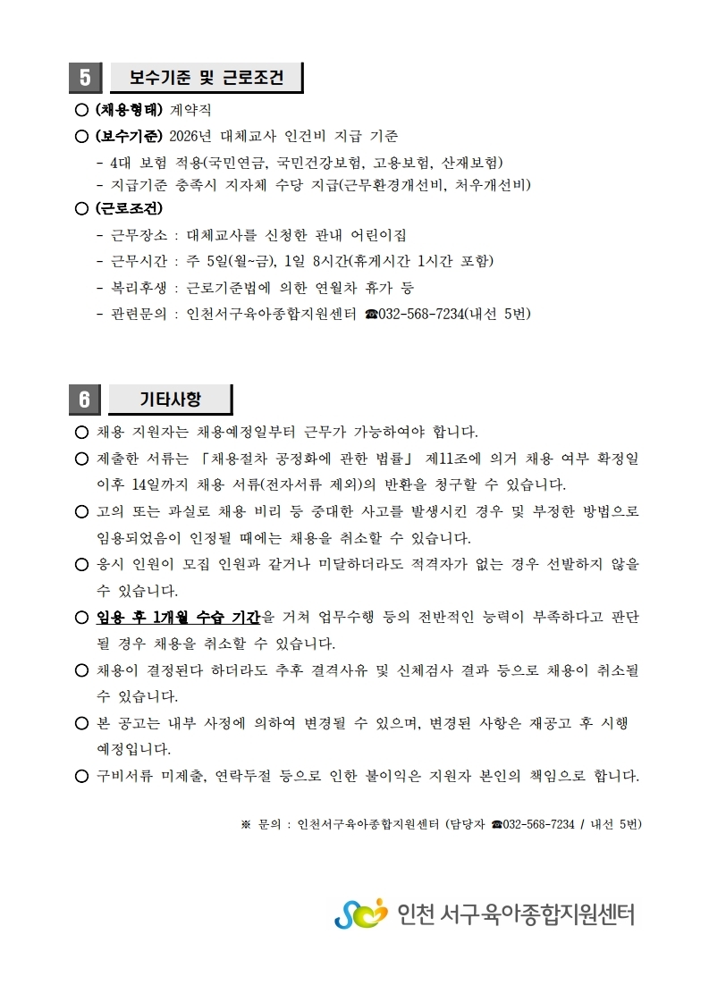 [인천서구육아종합지원센터] 인천서구육아종합지원센터 대체교사 6차 채용