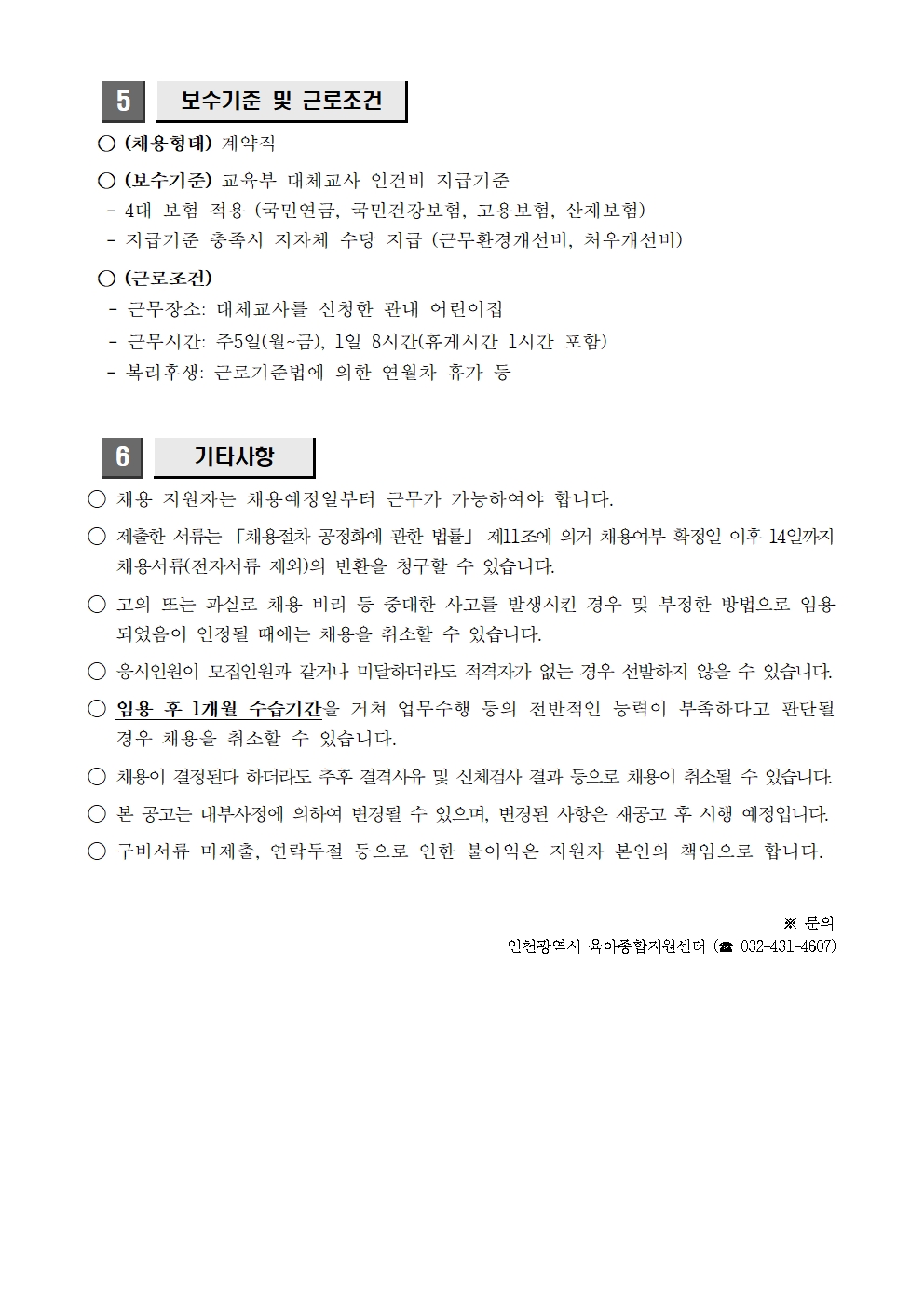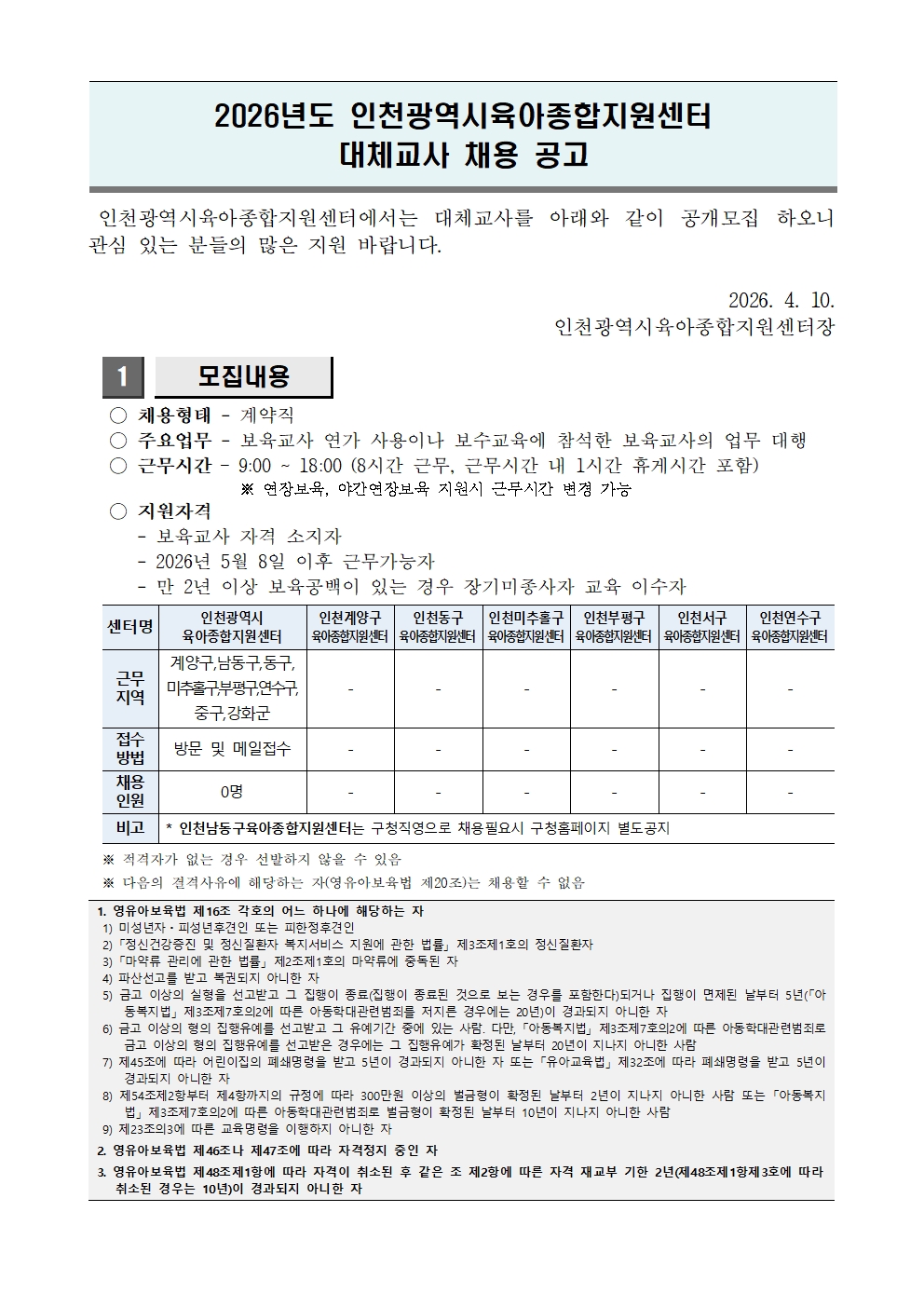 [인천광역시육아종합지원센터] 「2026년도 대체교사지원사업」 대체교사 인력채용