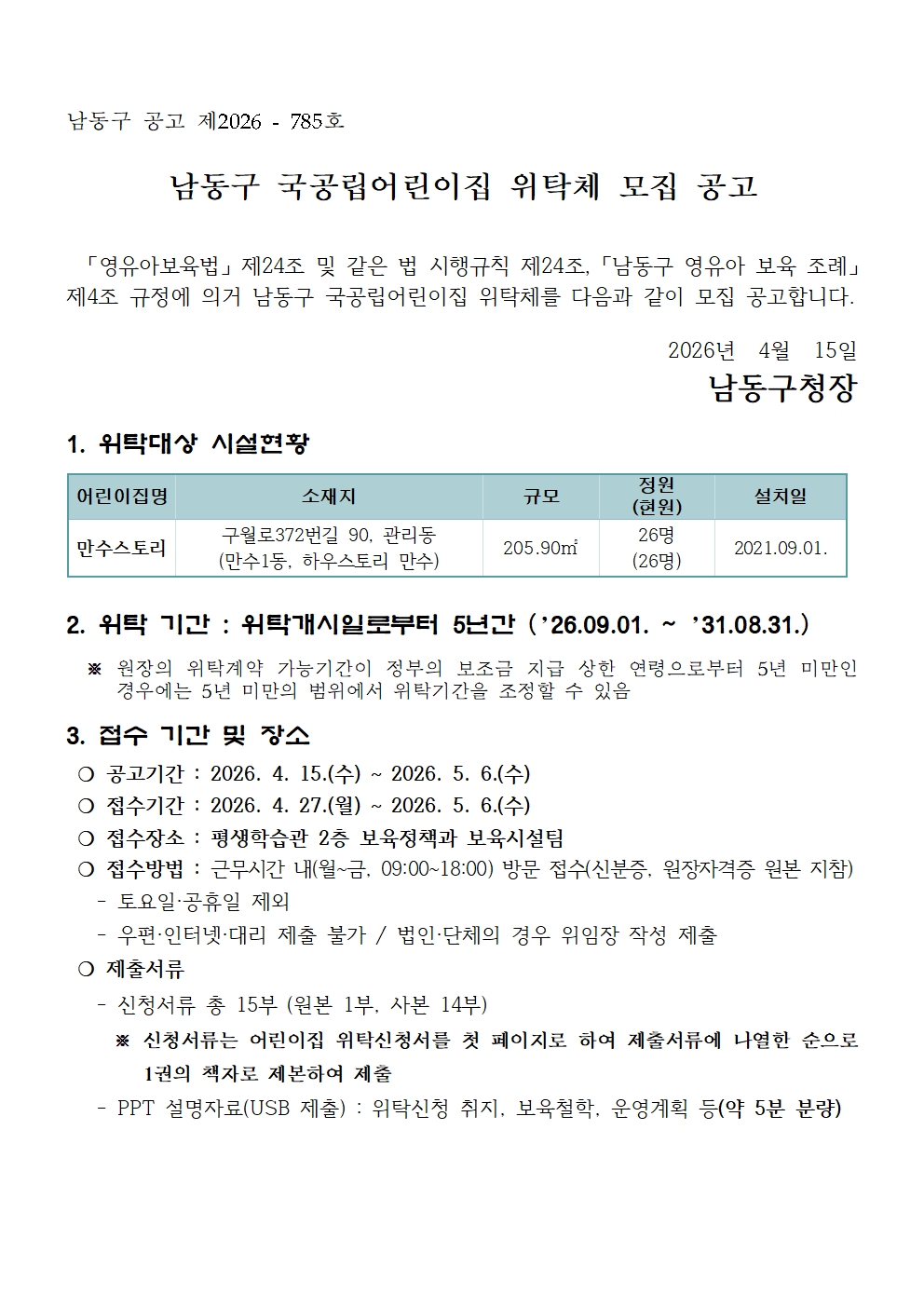 [남동구청] 남동구 국공립어린이집 위탁체 모집 공고