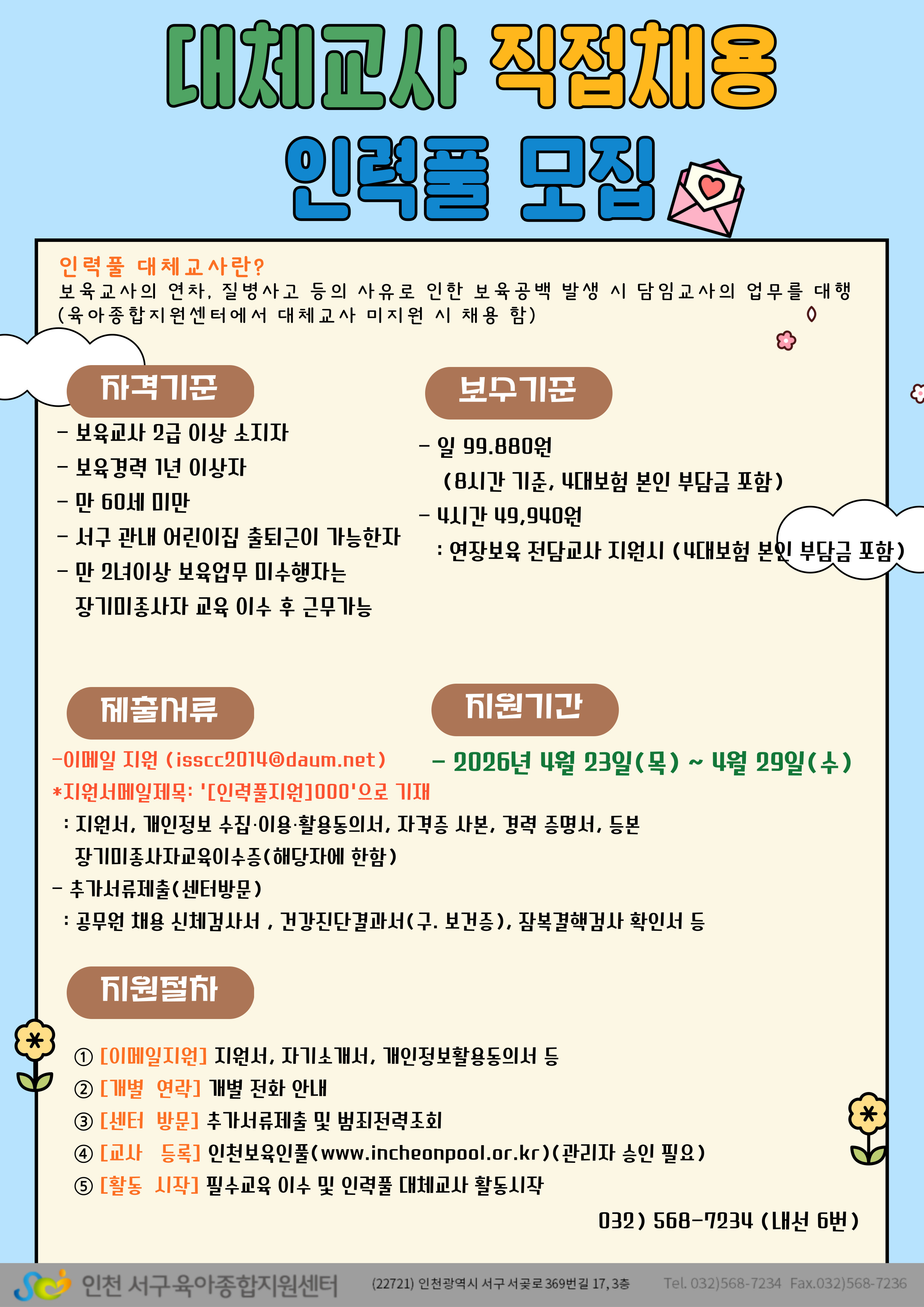 [인천서구육아종합지원센터] 2026년 대체교사직접채용 인력풀 모집
