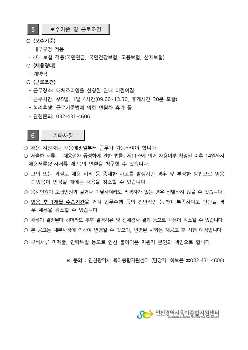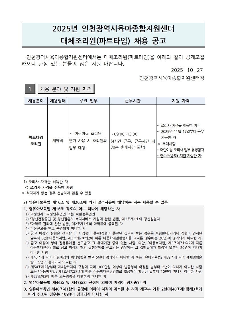 [인천광역시육아종합지원센터] 대체조리원 채용