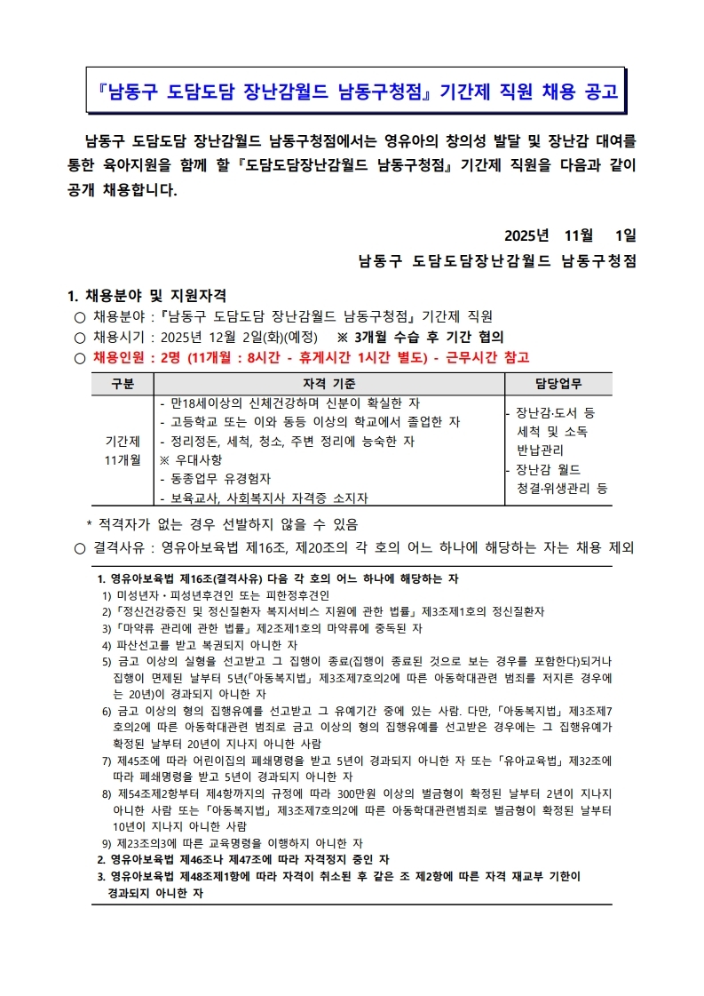 [남동구청] 2025년 12월 도담도담장난감월드 남동구청점 직원 채용 공고