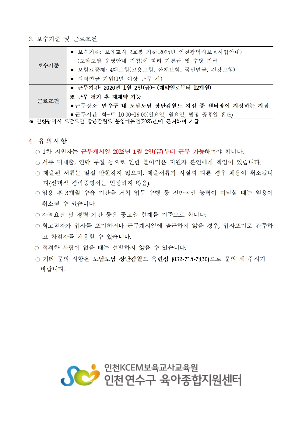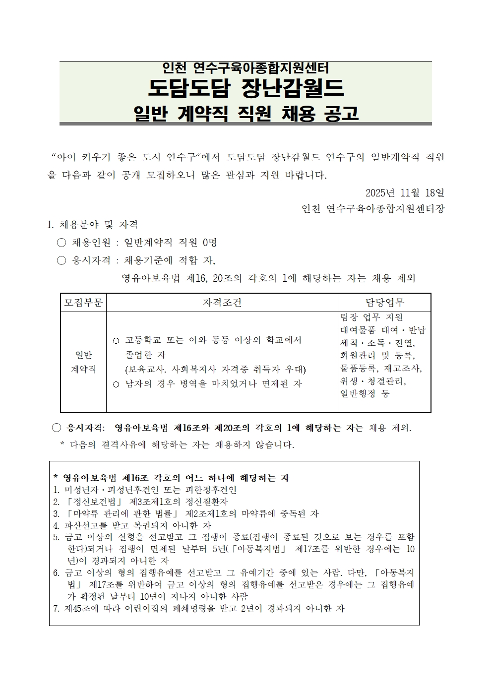 [연수구육아종합지원센터] 도담도담 장난감월드 일반계약직 직원 채용공