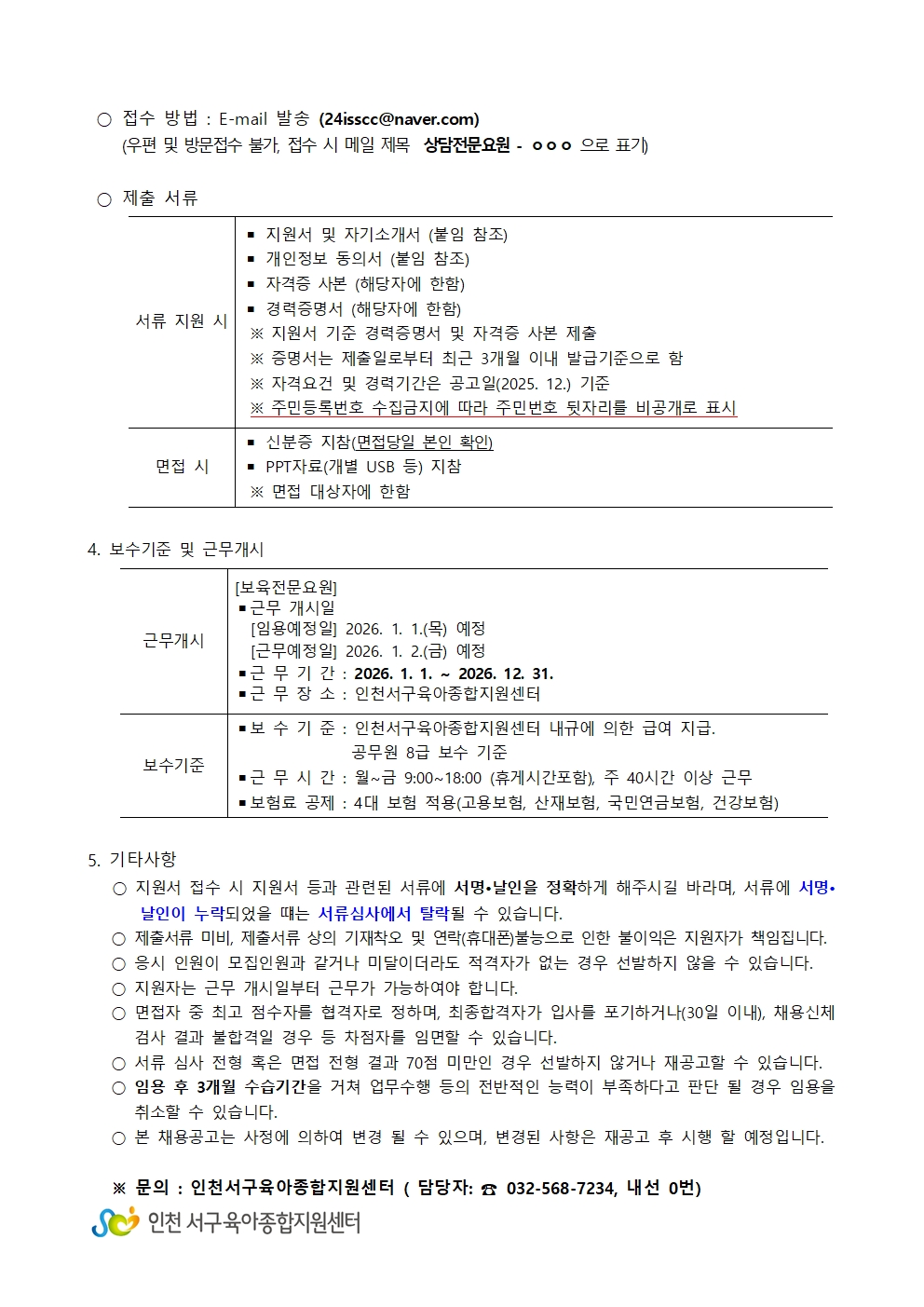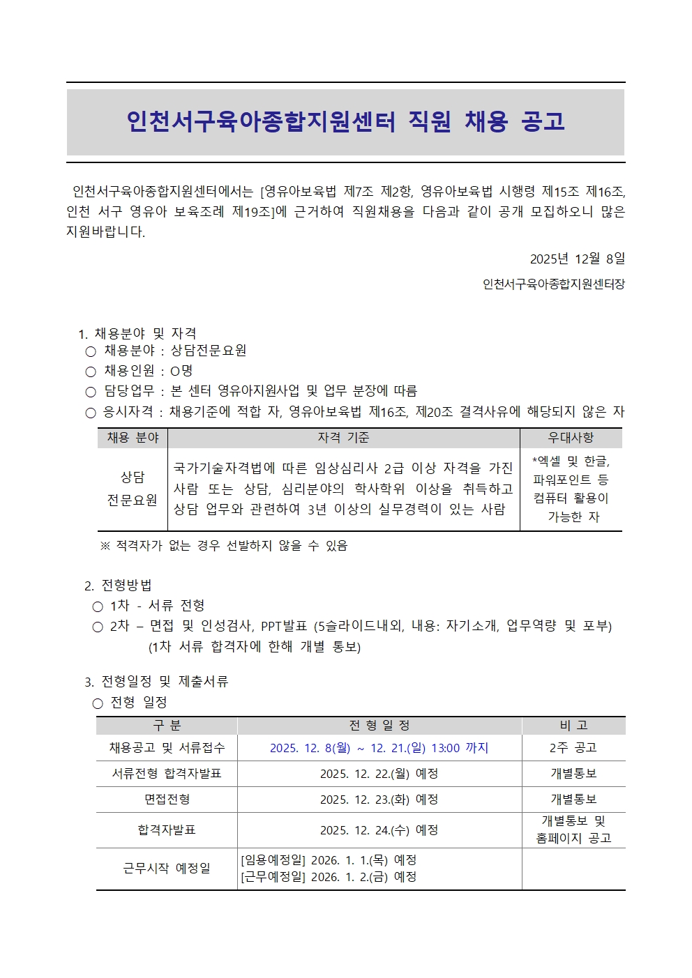[인천서구육아종합지원센터] 직원(상담전문요원) 채용 공고