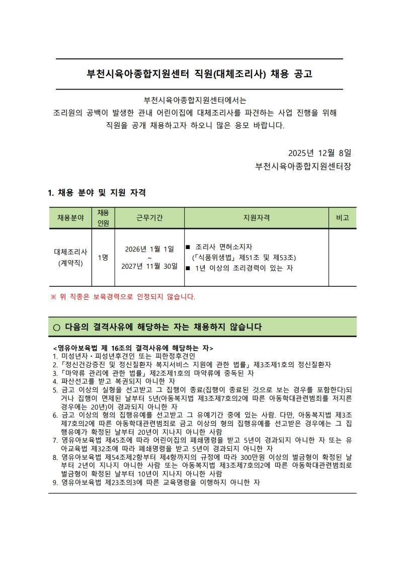 [부천시육아종합지원센터] 직원 채용공고(대체조리사)