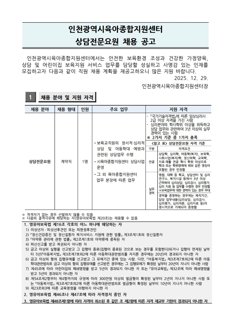 [인천광역시육아종합지원센터] 직원(상담전문요원) 채용 재공고