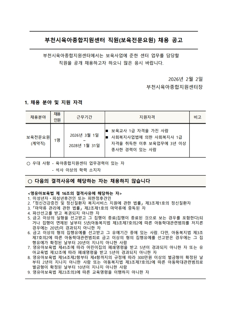 [부천시육아종합지원센터] 직원 채용공고(보육전문요원)