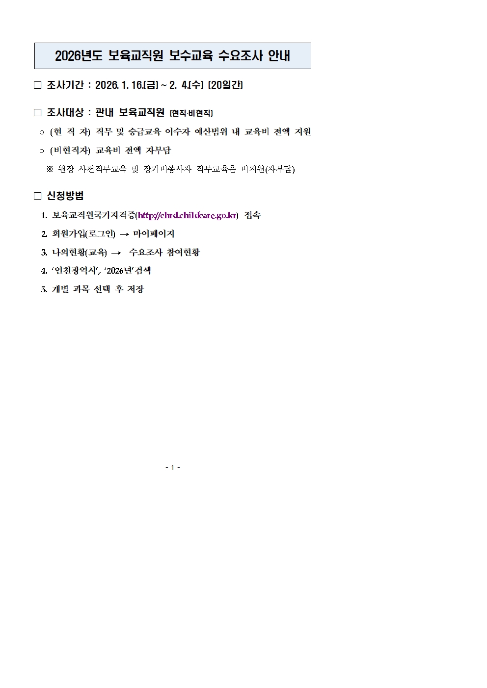 2026년 보육교직원 보수교육 계획 수립을 위한 수요조사 안내