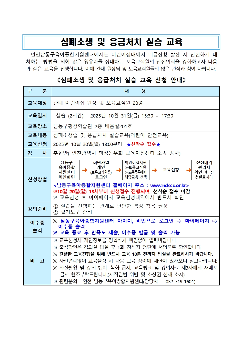 기타사항 | 이 교육은 2시간 실습교육이므로 온라인 2시간 이론교육을 이수하셔야 합니다! 이 교육은 실기교육으로 2시간 수료입니다. 교육시간은 15:30~17:30분입니다.이 교육은 실습교육으로 이수시간 2시간입니다 타구 보육교직원이 신청시 취소처리합니다. 남동구 관내사업으로 남동구교사에 한해서 승인처리됩니다. 사전에 온라인 등 이론교육을 2시간 이수할 것을 권장드립니다. 아래 어린이집 안전공제회 사이트 접속 이론 2시간 가능(1.15~12.31까지) https://e.csia.or.kr/user/edu/eduView.do?eduSeq=304&srchCtgry=50 실습에 적합한 복장을 착용하시기 바랍니다. 주차가 혼잡할 수 있으니 본청 주차장을 이용하시기 바랍니다. 문의 032-719-1601 |