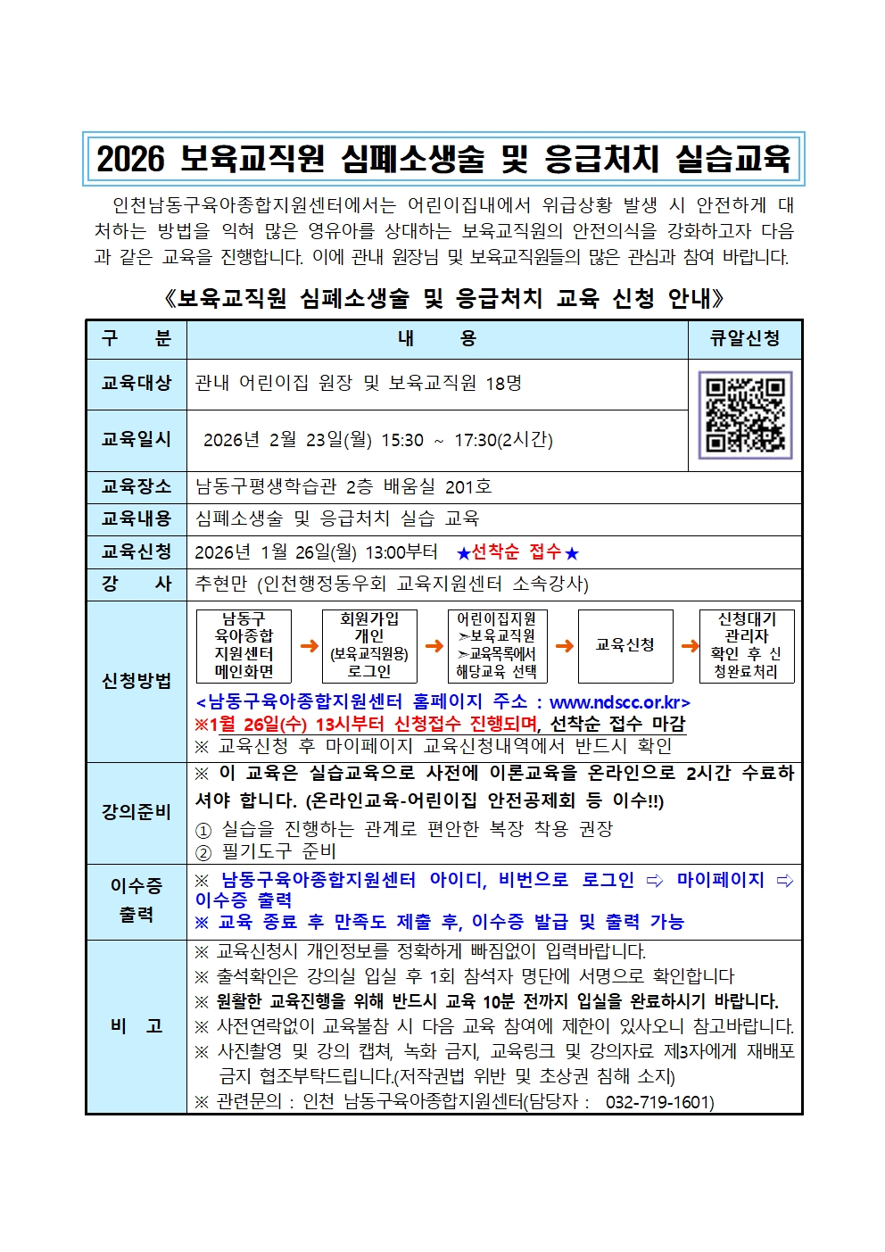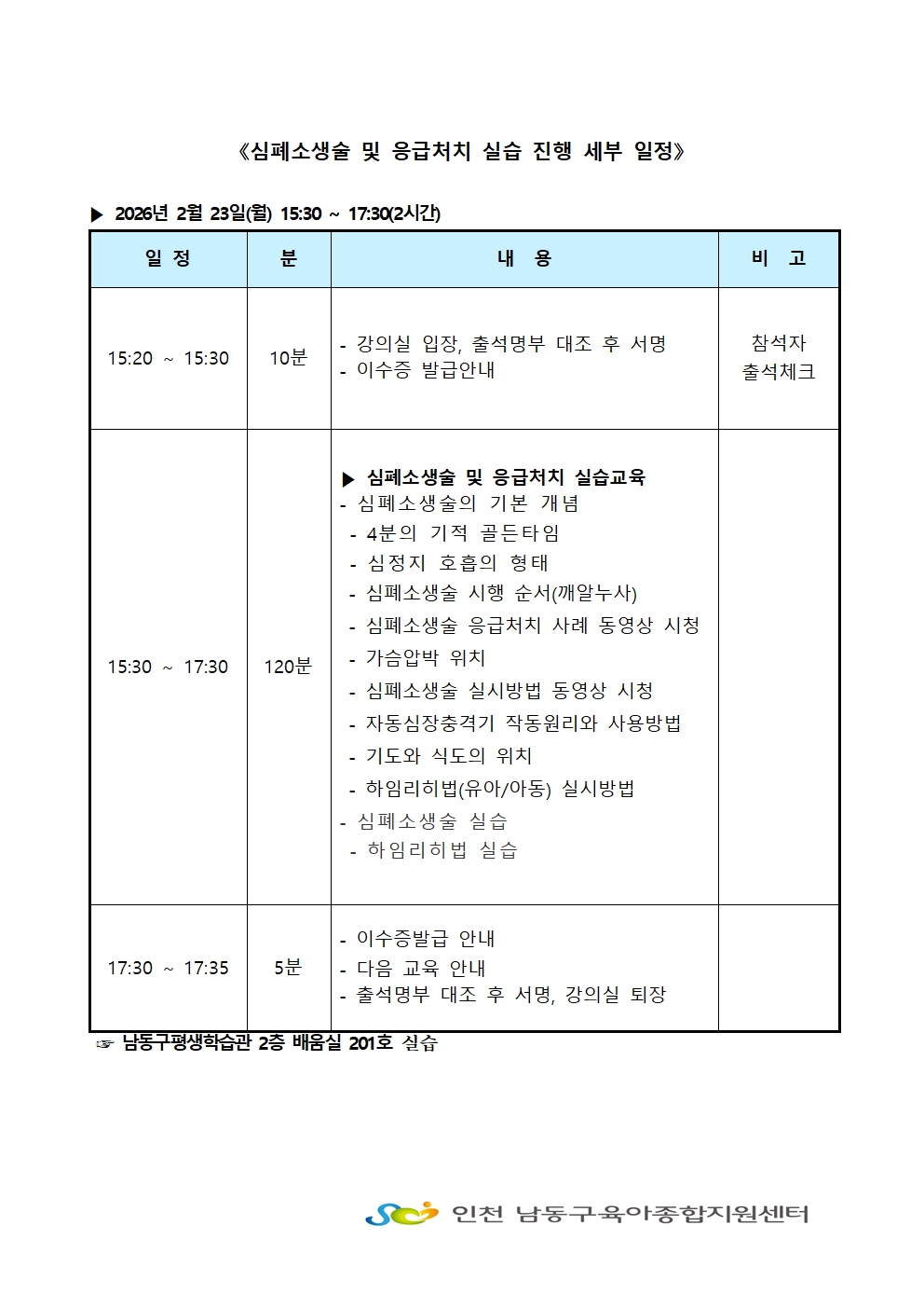 | 기타사항 | 필독사항~ 1. 이교육은 실습교육2시간에 해당하므로 이론교육을 어린이집 안전공제회 등에서 미리 이수하세요! 2. 교육전 첨부영상을 필히 시청하신 후 교육에 참여하세요 3. 인원이 소규모로 진행되므로 결석하시게 되면 차후 교육에서 불이익을 받습니다. 4. 불참일 경우 사전 연락으로 대기자에게 기회를 주세요!! |