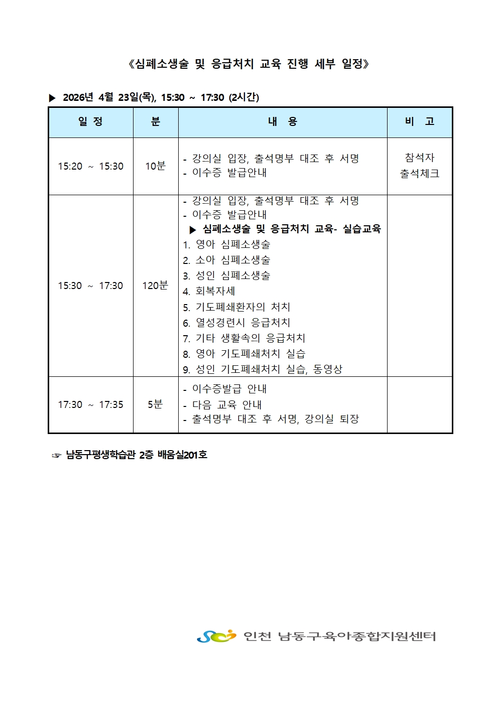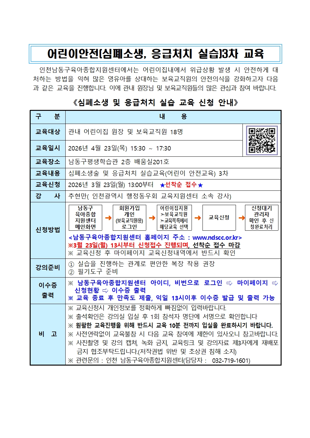 | 기타사항 | 이 교육정원은 18명으로 실습 위주의 교육이며, 노쇼는 사전 연락을 주셔서 대기정원에게 기회를 주셔야 합니다. 이론은 중앙육아종합지원센터 또는 어린이집 안전공제회 에서 이수하여 2시간 수료증을 확보하시기 바랍니다. 센터에서는 2시간 수료증이 나갑니다. |
