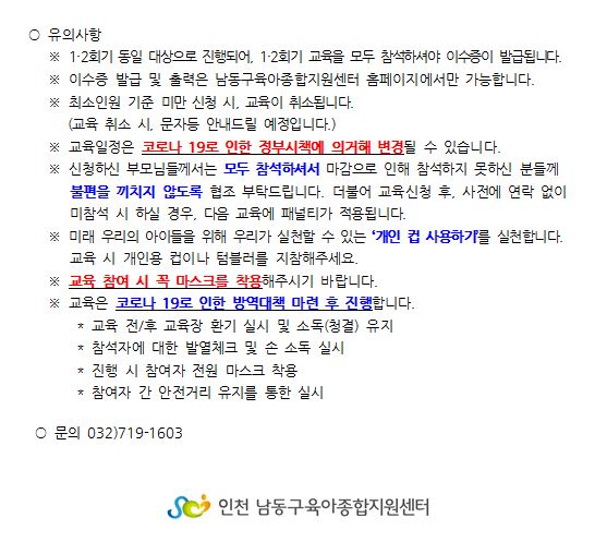 | 기타사항 | ★ 1회기 신청시, 2회기까지 진행되는 부모교육입니다. 1회기 신청시 자동으로 2회기까지 신청됩니다. ★ 안내문에 있는 유의사항을 꼭 읽어주시기바랍니다. ★ 본 교육은 상황에따라 연기, 취소될 수 있습니다. |