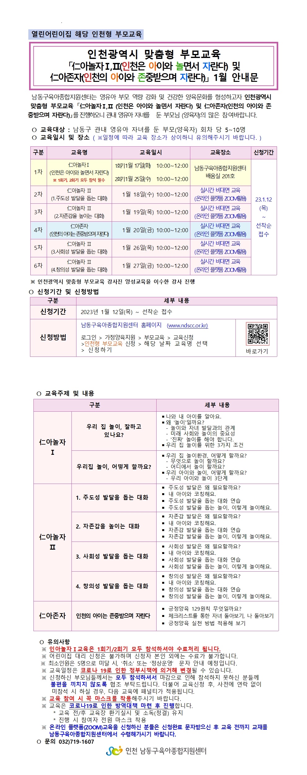 | 기타사항 | ★ 최소기준(5명) 미만 신청시 교육이 취소됩니다.(교육 취소 시 문자 등 안내) ★ 본교육은 실시간 비대면 교육(온라인 플랫폼 ZOOM활용)입니다. 교육시 필요한 교재교구는 남동구육아종합지원센터로 직접 방문하여 수령하시기 바랍니다. |
