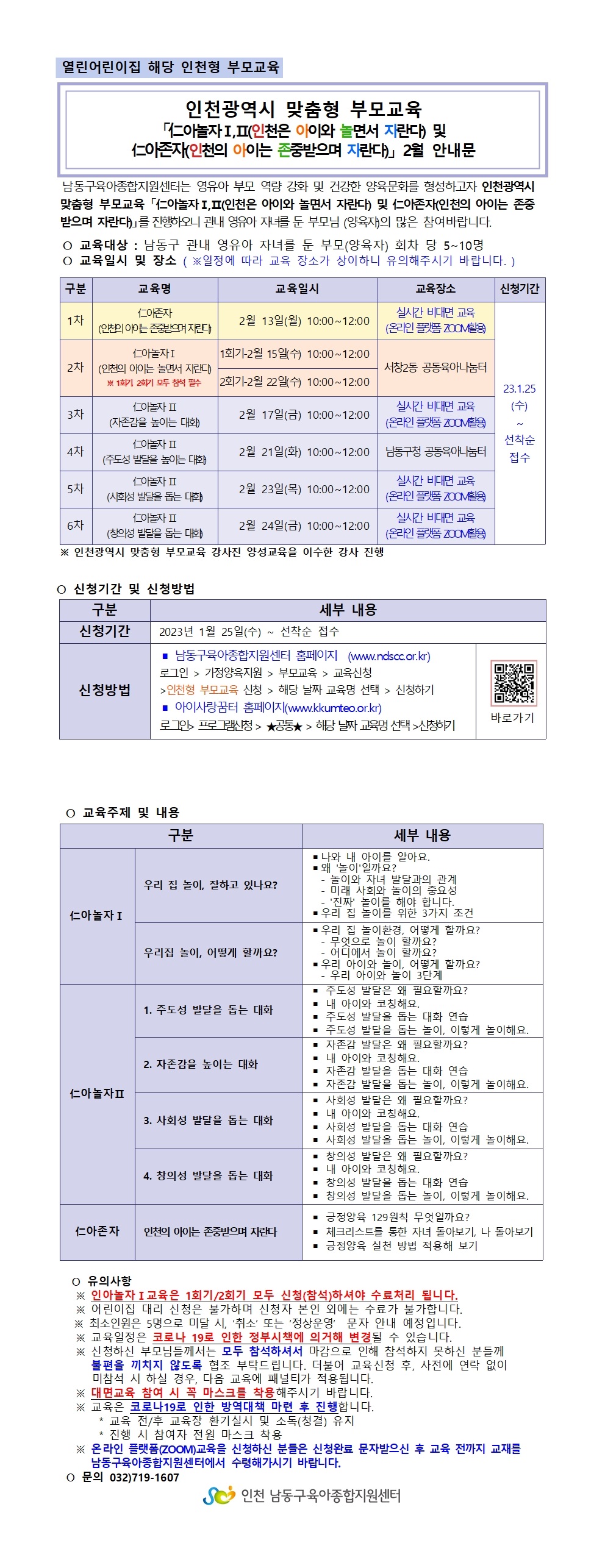 | 기타사항 | ★ 최소기준(5명) 미만 신청시 교육이 취소됩니다.(교육 취소 시 문자 등 안내) ★ 본교육은 실시간 비대면 교육(온라인 플랫폼 ZOOM활용)입니다. 교육시 필요한 교재교구는 남동구육아종합지원센터로 직접 방문하여 수령하시기 바랍니다. |