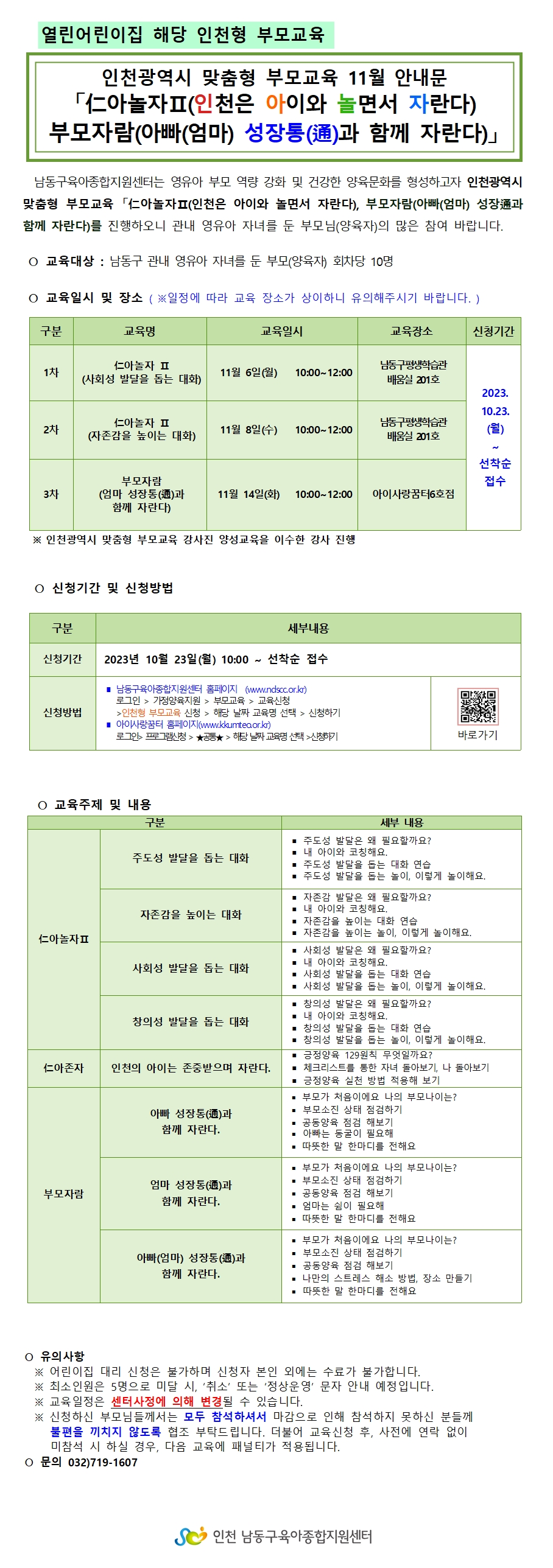 | 장소 | 남동구평생학습관 2층 남동구육아종합지원센터 배움실 201호 | ||