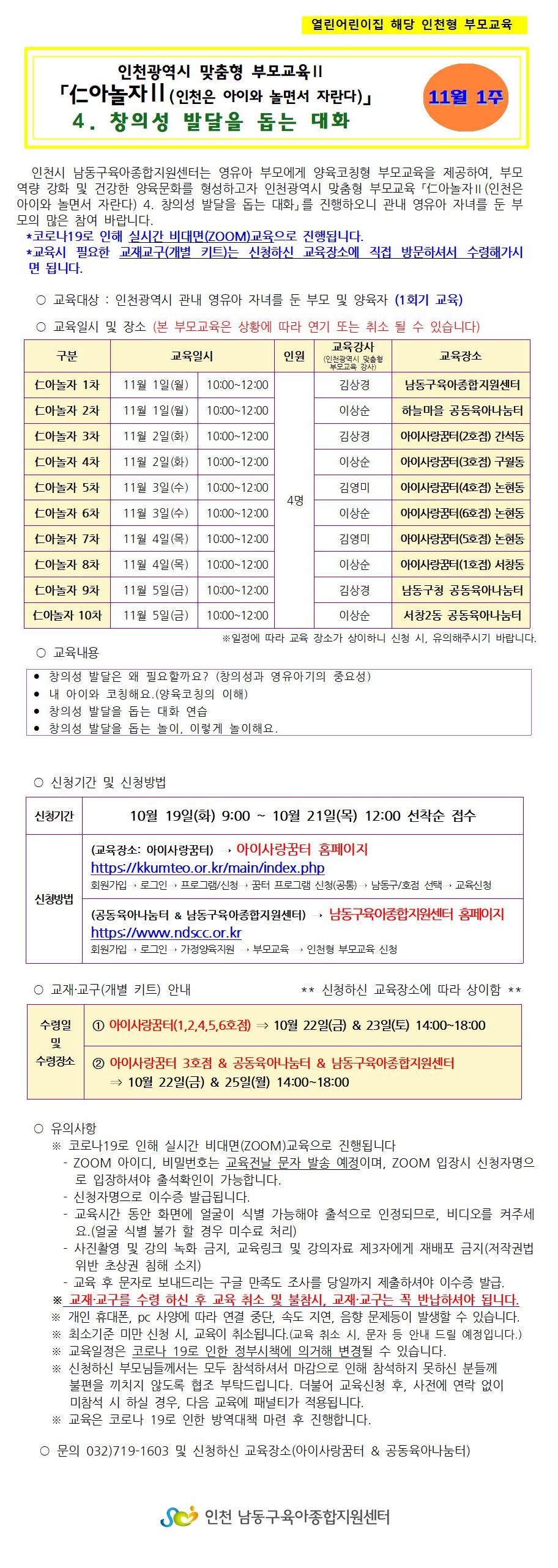 | 기타사항 | *교육시 필요한 교재교구(개별 키트)는 신청하신 교육장소에 직접 방문하셔서 수령해 가시면 됩니다. *교재교구 수령은, 신청하신 교육장소에서 10/22(금) 또는 10/25(월) 14:00~18:00 가능합니다. |