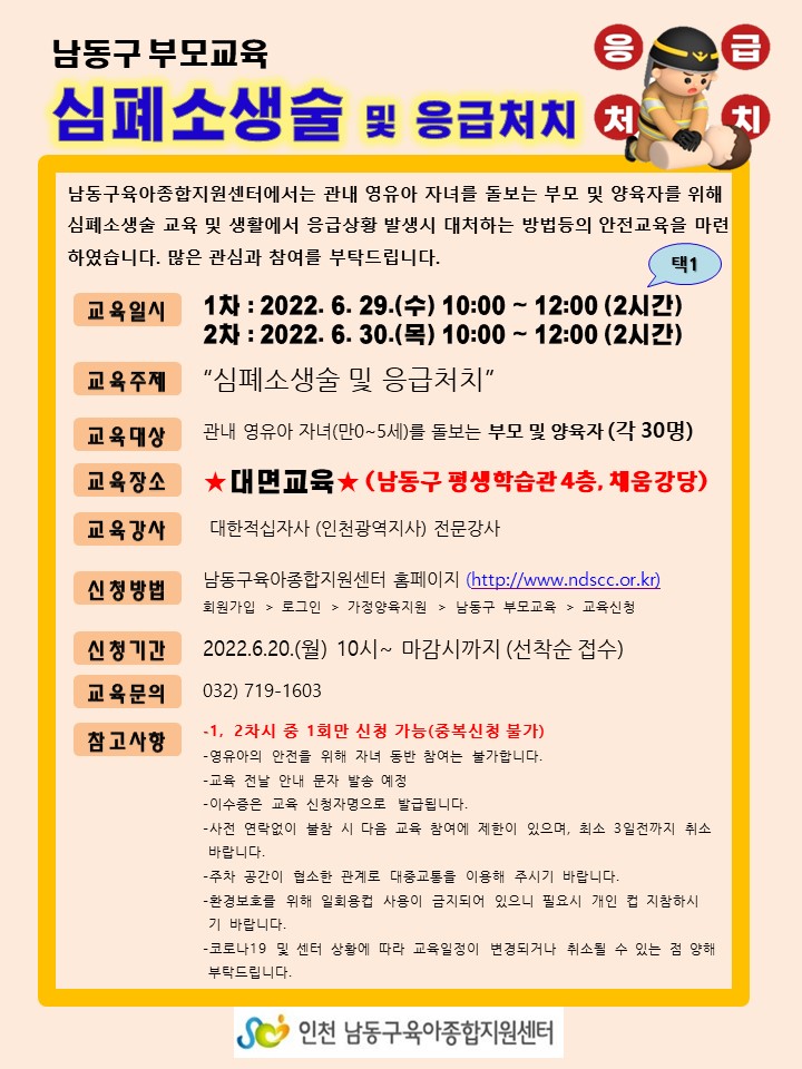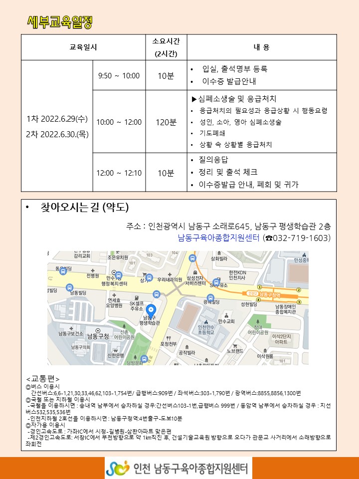 | 기타사항 | ※ 대면교육입니다. ※ 1,2차시 중 1회만 신청가능합니다.(중복신청 불가) ※ 주차 공간이 협소한 관계로 대중교통을 이용해 주시기 바랍니다. ※ 이수증은 남동구육아종합지원센터장 발급으로 본 교육은 2시간 특강으로 대한적십자사 발급되는 4시간 교육 이수증이 아닙니다. |