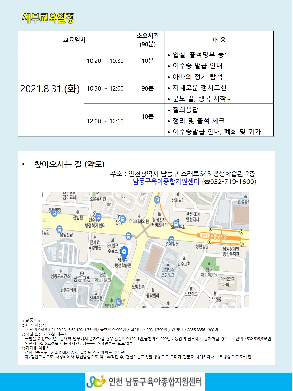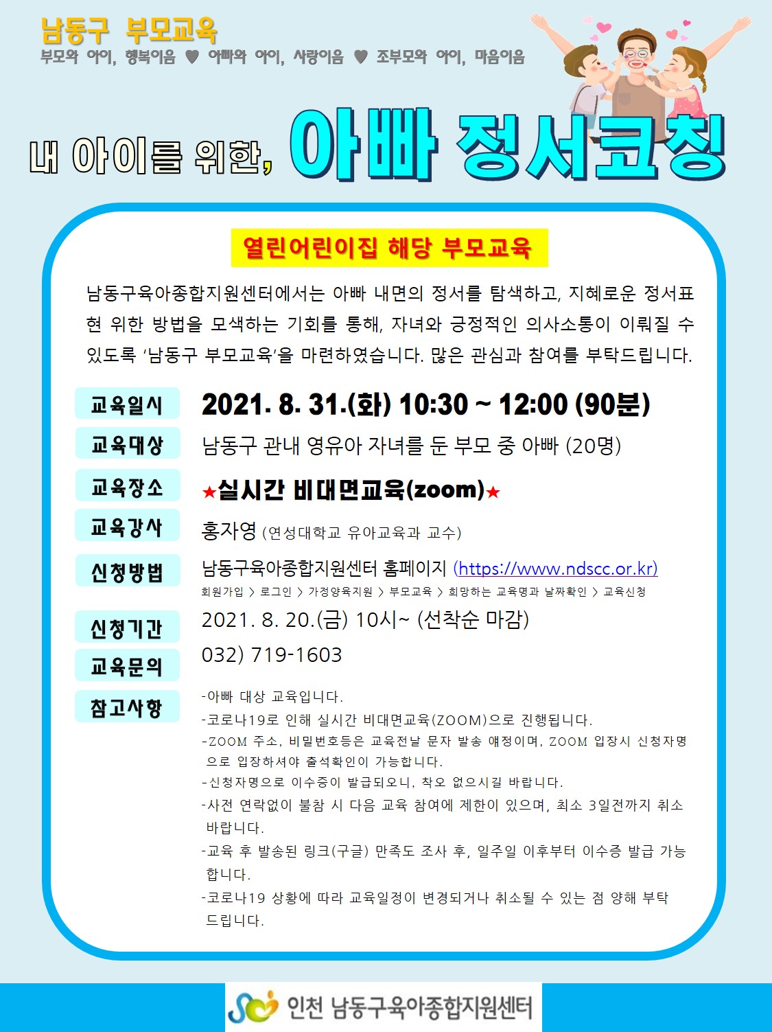 | 기타사항 | ※ 아빠 대상 교육입니다. ※ 교육시간 동안 화면에 얼굴식별이 가능해야 출석으로 인정됩니다. 비디오를 꼭 켜주세요(얼굴식별 불가시 미수료 처리됨) ※ 사전 연락없이 불참 시 다음 교육 참여에 제한이 있으며, 최소 3일전까지 취소바랍니다. |