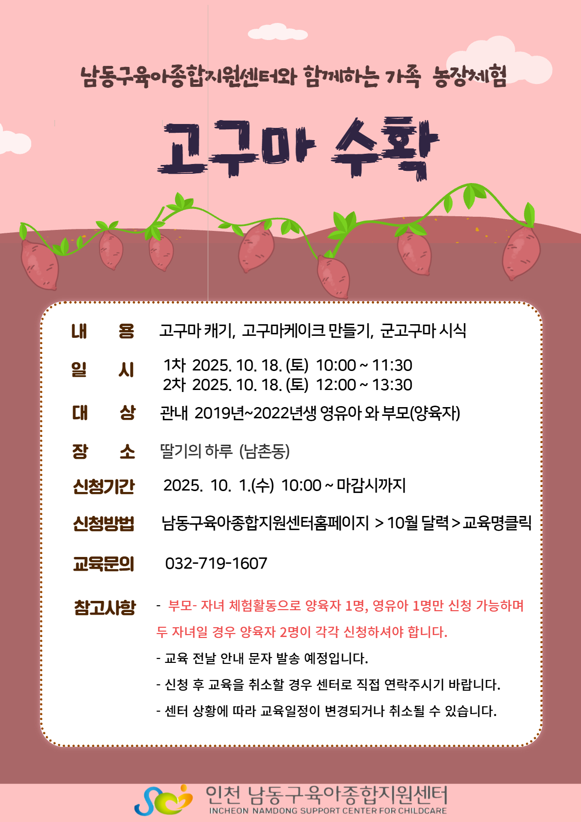 기타사항 | * 부모-자녀 체험프로그램으로 양육자 1명, 영유아 1명만 신청 가능하며 두 자녀일 경우 양육자 2명이 각각 신청하셔야 합니다. * 우천시 취소되거나 일정이 변경될 수 있습니다. |