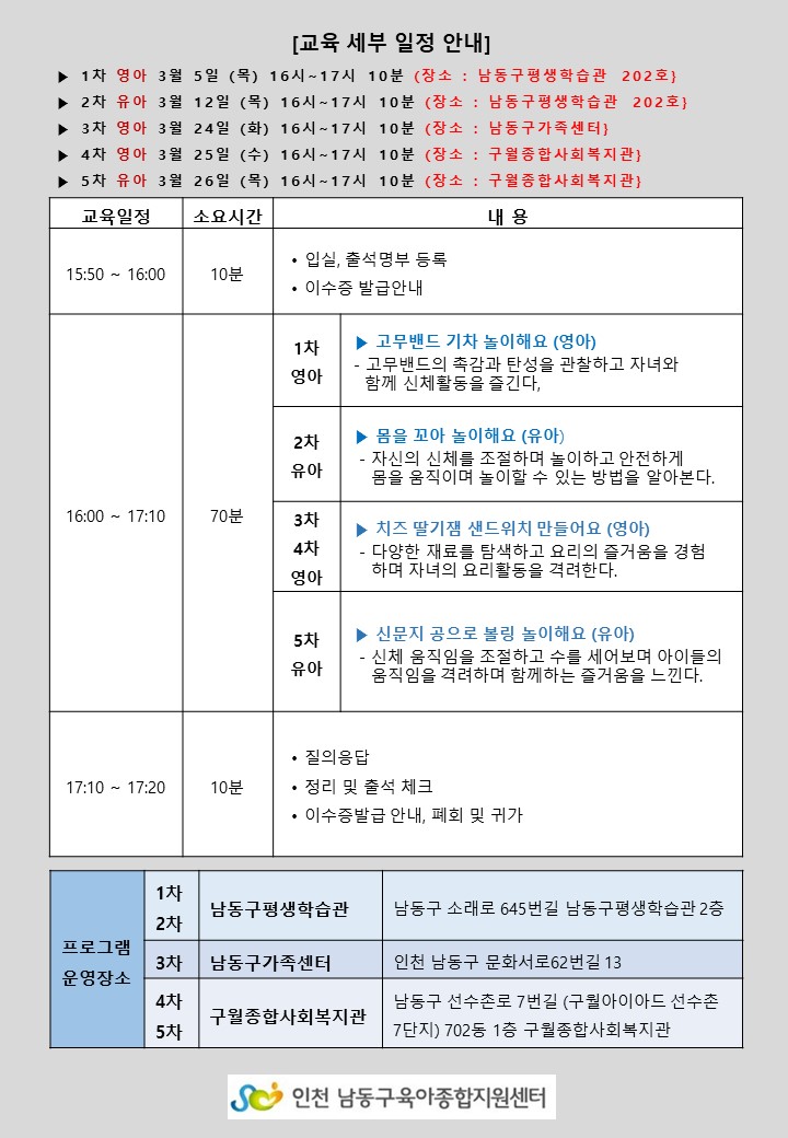 | 기타사항 | ★ 자녀 연령을 꼭 확인하시고 신청 부탁드립니다. ★ 체험 장소가 구월종합사회복지관입니다. 확인하시고 신청 부탁드립니다. ★ 구월종합사회복지관에서 우선 신청 가능합니다. ★ 정부 "재활용폐기물 종합대책"에 따라 일회(1회)용품 사용을 금지합니다. 교육 참여 시 개인 컵을 꼭 지참해 주시기 바랍니다 |